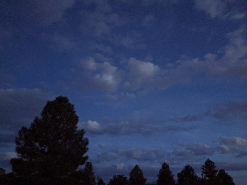 We were in Arizona and there are so many mountains and I couldn’t wait for the first beautiful sunset. We arrived at a park near Flagstaff about 10 minutes before sunset. Plenty of time right? Wrong. With the trees on the left and mountains on the right, you could see the sun setting and reflecting on the mountains to the right. And crazy me. I was running to try to get beyond the trees to actually observe the sun on the horizon but it kept moving. BTW, I learned the word alpenglow, which means a rosy glow from the sun on the mountains. It was beautiful and we caught the sunset to our left. Then we meandered back to the beginning of the park and my brother-in-law thinks it’s funny to pretend to put his head in the rear of a buffalo. (Actually we were all laughing hysterically). While we were discussing our unintelligent hyjinks, this intelligent-looking man approached and asked if we were here for the naked eye astronomy lecture. We looked at each other stupidly. Then he said he wasn’t going to take attendance (wink wink). We followed behind and eventually realized we are now part of the Northern Arizona University lecture. Lucky for us. I later researched and found out he was in charge of the astronomy facilities at the university. Anyway, we were able to see, with his guidance, Venus, Jupiter, Saturn, the big and little dippers, Orion, and the Milky Way, blocked partially by the clouds. The stars were brighter than any I have ever seen. And we learned about Dark Sky cities.